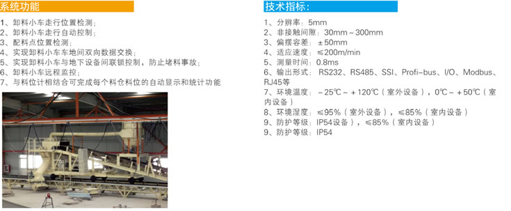 卸料小車自動布料系統(tǒng)主要用于散狀物料處理、礦山系統(tǒng)、堆場系統(tǒng)、礦石處理、裝載系統(tǒng),輸送系統(tǒng)以及港口設(shè)備系統(tǒng)中卸料小車精確定位和自動控制,如港口料場堆取料設(shè)備定位裝卸和集中監(jiān)控,廠區(qū)料場、燒結(jié)廠、耐火廠卸料小車的精確定位裝卸和集中臨控焦化廠配煤盤、翻車機、葉輪給煤機的定位聯(lián)鎖:其它有軌移動設(shè)備的精確定位和集中監(jiān)控。卸料小車可以在輸料系統(tǒng)中將上料皮帶機上的料卸在指定的倉位或料棚里。為達(dá)到一臺卸料小車能給不同的料倉或料場卸料,卸料小車能沿著上料皮帶機運行方向進(jìn)行正反方面的運行。此外,結(jié)合料位計可完成每個料倉料位的自動顯示和統(tǒng)計功能。提高配科效率,節(jié)約成本,提高企業(yè)產(chǎn)值,有效提高競爭力。